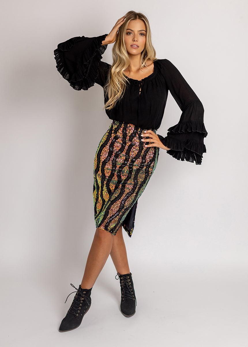 Elevate your wardrobe with our versatile long sleeve Devina Top. perfect for any occasion! Featuring stylish bell sleeves with ruffles. this top can be worn on or off the shoulder for a customizable look. The elastic boat neck and front keyhole opening add a touch of elegance. while the functional front tie enhances its relaxed fit. The trendy high-low hem ensures you can easily dress it up or down to suit your style. Pair it with anything in your closet for effortless chic!