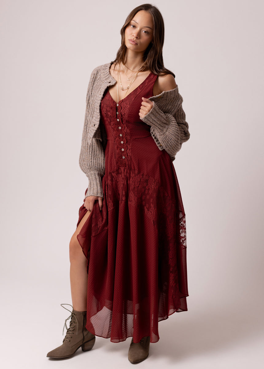 This tank dress is designed with a deep V-neckline and a low scoop back that give it a feminine feel. The flowing saddle hem cut adds beautiful movement. making it just as perfect for a casual day out as it is for a night with friends. Functional shell buttons down the front add a touch of charm. while delicate lace piecing brings soft. romantic detail. An invisible zipper at the back keeps the look clean and easy to wear. Effortless yet stylish. this boutique dress is a go-to piece you'll reach for again and again.