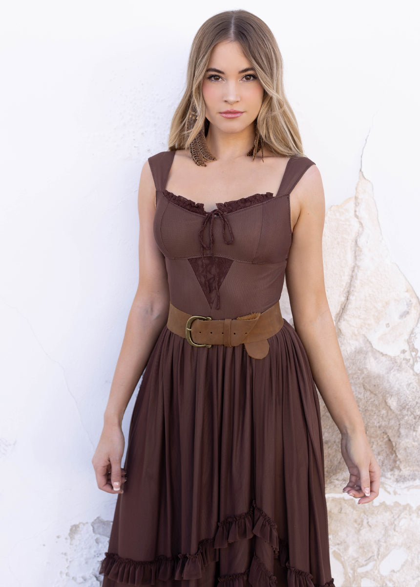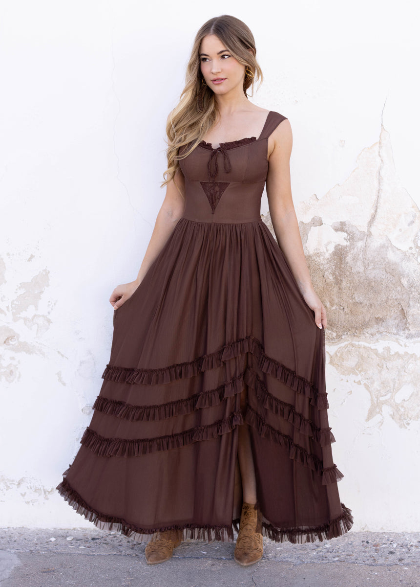 Designed with refined craftsmanship. the dress includes a mesh bodysuit that is fully lined for a flawless fit. The back closure features a standard adjustable bra clasp. while the tapered shoulder straps provide elegant support. A seamed design with elastic at the underbust offers gentle shaping. and the lace bralette sewn inside adds delicate allure. The dress is finished with three tiers of ruffles. scalloping downward with a marrow edge. creating a soft. romantic flow. Layered lace and mesh combine for a dreamy ruffle effect. with a dainty lace bow sewn at the center front. enhancing the dress's ethereal charm.