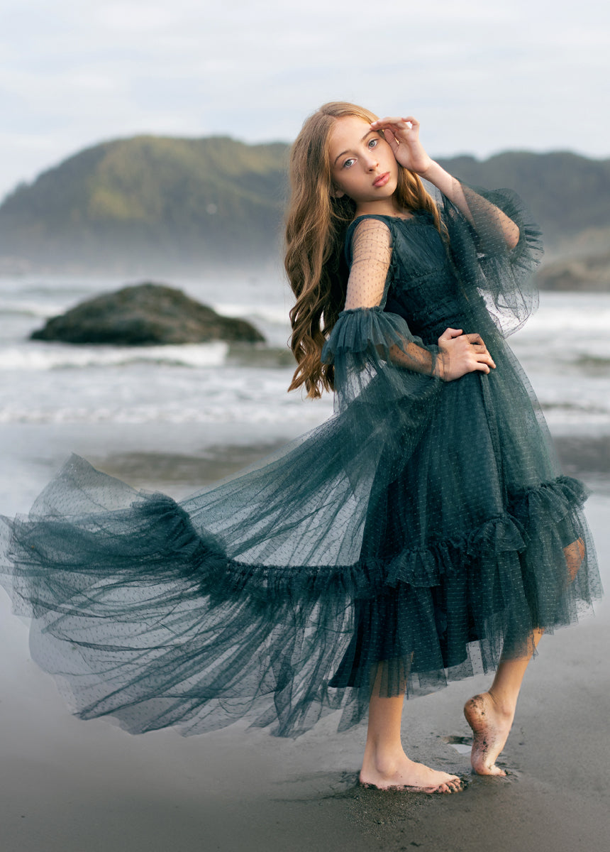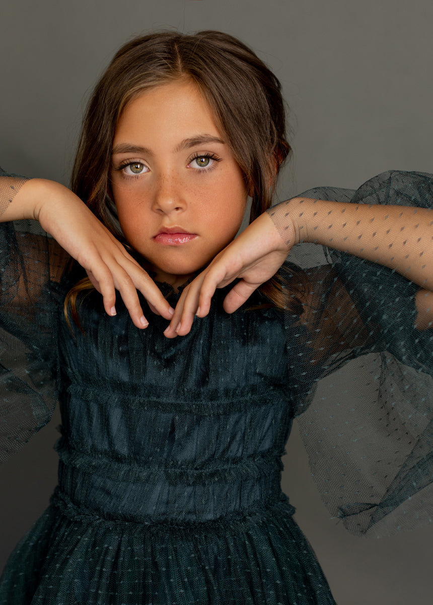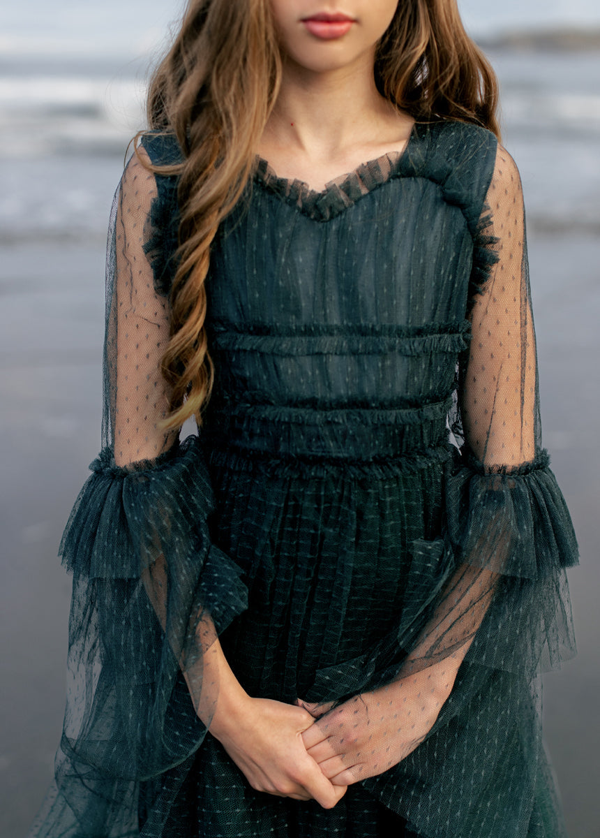 Transform any special occasion with the Halsey Impact Dress in Deep Spruce. Made from exquisite. delicate tulle. this dress makes a commanding statement with its impactful design. Ensure that your little one feels confident like a princess in this breathtaking piece.