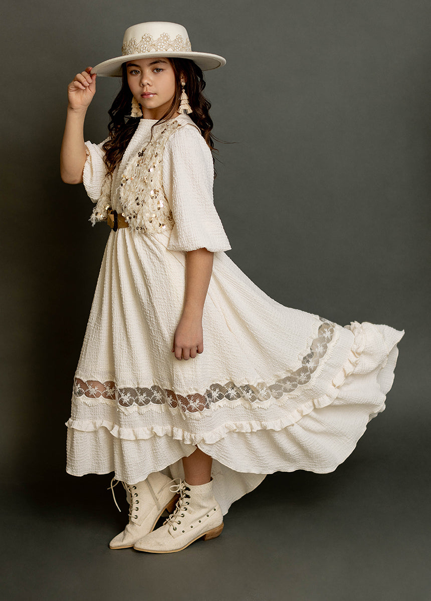 Embrace the perfect blend of girly and stylish with our Karlie Dress in cream. designed to make your little one shine at any occasion. This stunning high-low maxi length dress features a chic boat neckline and playful 3/4 balloon sleeves for a delightful look. The criss-cross straps at the back add a trendy twist. while the low scoop back enhances its elegance. With a short length lining and a stretchy waist. this dress ensures comfort and a flattering fit for all-day wear. Make every moment special with the Karlie Dress. a must-have addition to her wardrobe!