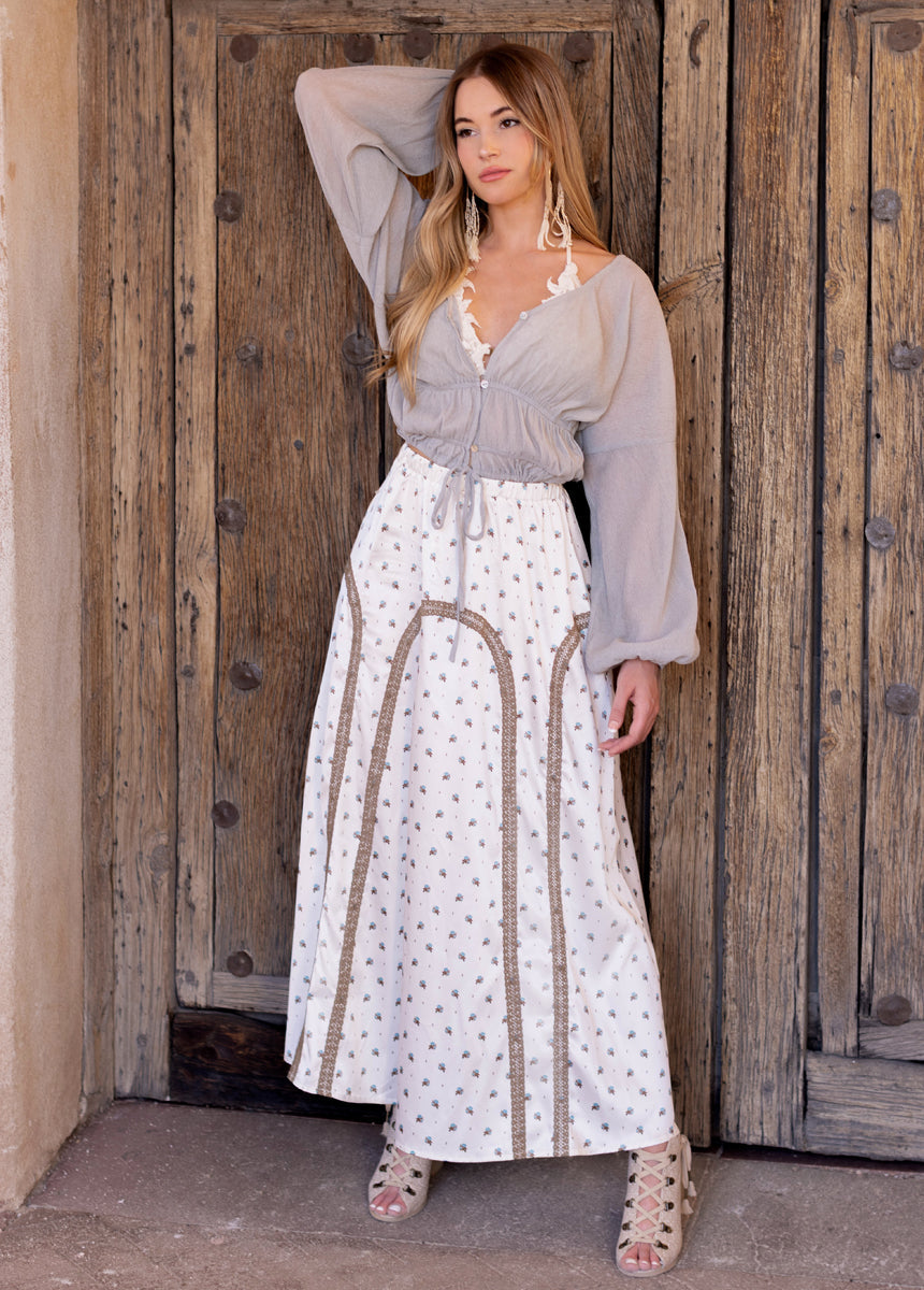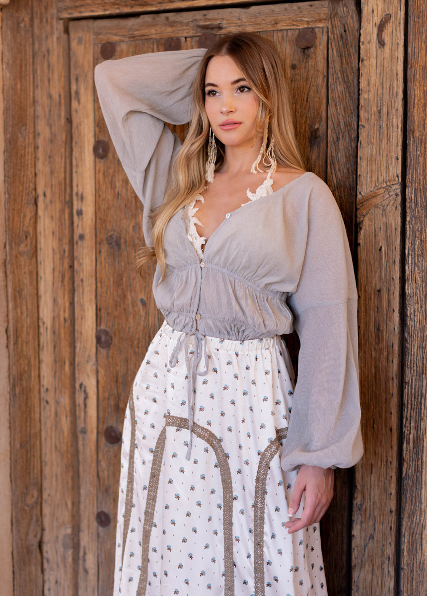 Add a touch of elegance to your wardrobe with the Kimber Top. This top features a flowing. long-sleeve crop top available in two stunning colors: classic cream and rich wine. The billowy sleeves create a romantic. ethereal vibe. while the front tie detail adds a playful flair. The cream top pairs beautifully with a maxi skirt for a breezy. free-spirited look. while the wine top makes a bold statement when styled with denim. Whether you're heading to a festival. brunch. or a casual date. the Kimber Top offers versatile styling with a bohemian-chic aesthetic.