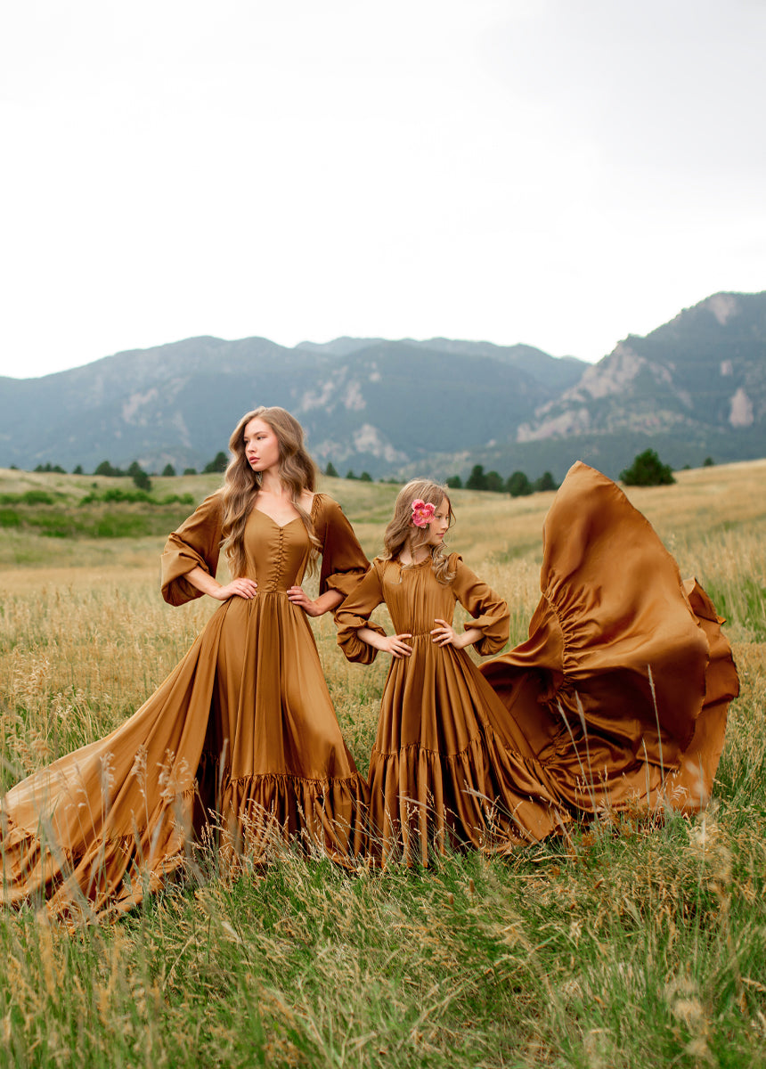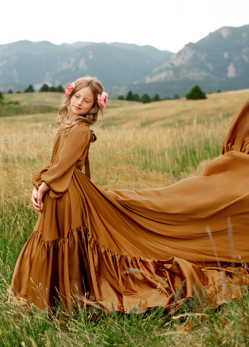 Disclaimer: This dress has been designed for fun and whimsical purposes. to delight your child as she wears it. The garment has a long train to create beautiful and impactful images. but it is not designed for unattended play. nor for use without a guardian nearby. There is a bustle to fasten the train to make it easier to walk in: simply fasten the two clear buttons on the underskirt through the loops at the waist. It is our genuine hope that your child feels special and adored while also staying safe!