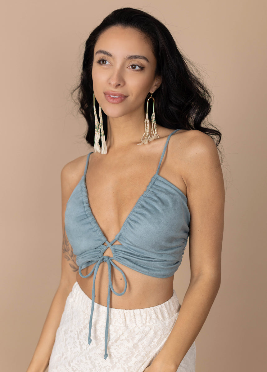 This bralette features a plunging V-neckline with ruched detailing and a crisscross drawstring tie at the front. allowing for an adjustable fit. The thin spaghetti straps give it a delicate and feminine touch. while the soft. muted blue shade adds a subtle. elegant vibe. The fabric appears lightweight. making it ideal for casual or festival-inspired styling. It has a ruched back panel for added texture and visual interest. This bralette offers versatility. pairing well with floral skirts. denim. or bohemian-inspired outfits. Overall it exude a carefree. summery feel. making them perfect for casual outings or layered festival looks.