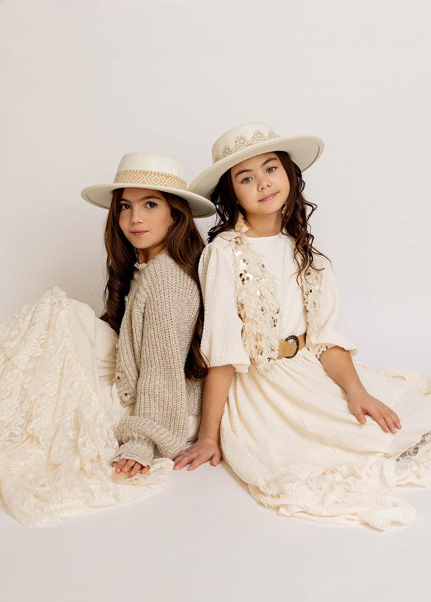 The Minnie Cardigan in Ecru is an essential addition to any little one's wardrobe. combining style and comfort effortlessly. Made from soft and cozy fabric. it's perfect for layering and keeping warm during cooler days. The high-low length and boat neck design offer a trendy touch. making it easy to pair with any outfit. With its wide sweep and functional front buttons. this cardigan provides both versatility and ease of wear. Elevate your little one's style with the Minnie Cardigan. a must-have piece for every fashion-forward child!