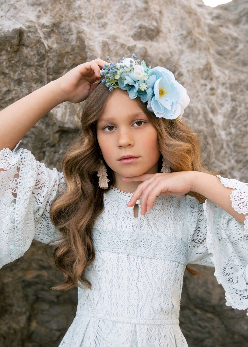 This Murni Dress in Blue Whisper is the perfect combination of girly and feminine. with soft crochet lace detailing. Embrace a playful and girly style with this dress that is sure to turn heads. Perfect for any occasion. this dress will have you feeling confident and stylish.