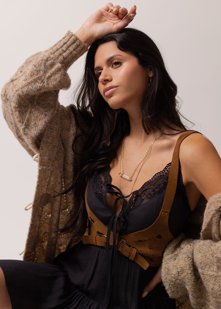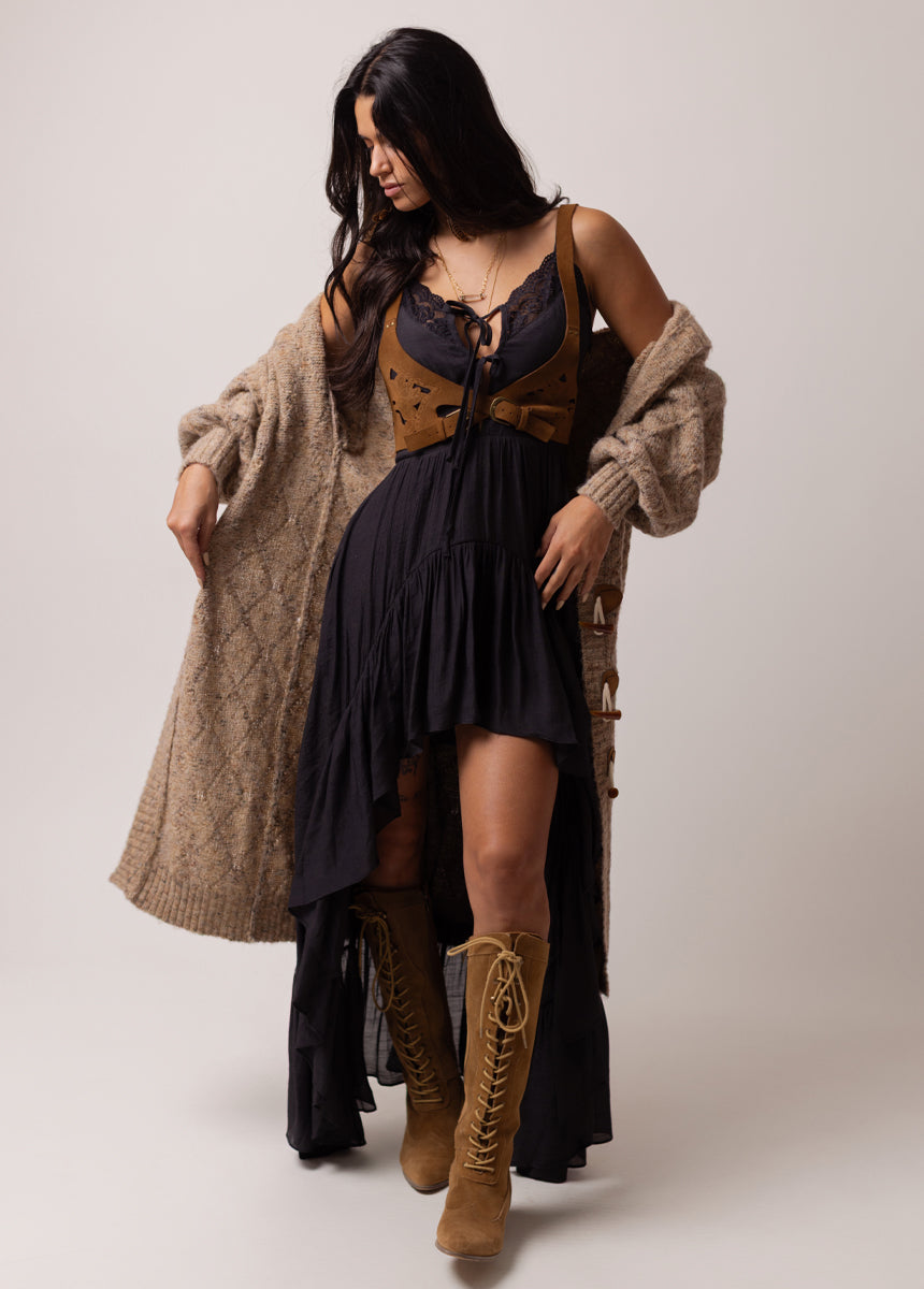 This feminine boutique dress features clean-finish straps with delicate lace trim that highlight the neckline beautifully. Princess seams shape the bodice for a flattering fit. while an invisible side zipper keeps the look sleek and seamless. A high-low hemline adds modern movement. finished with a soft baby hem for a polished touch. The seamed-in ruffle along the hem brings a playful. romantic detail that feels effortlessly chic. Perfect for special occasions or elevated everyday wear. this lace-trim dress is a timeless addition to any women's boutique wardrobe.
