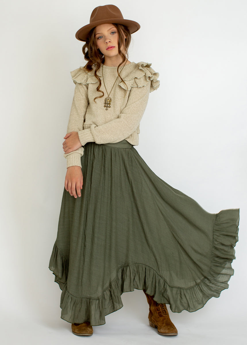 Elevate her cool weather wardrobe with this fashionable ruffle sweater. the ideal complement to any outfit. Featuring a classic crew neckline. this sweater offers a relaxed fit that ensures comfort and ease of movement. The delightful ruffles at the shoulders add a whimsical touch. making it a standout piece for any occasion. Ribbed cuffs and hemline provide a snug finish. keeping her warm and stylish during chilly days. Make this ruffle sweater a staple in her collection. perfect for layering or wearing on its own!