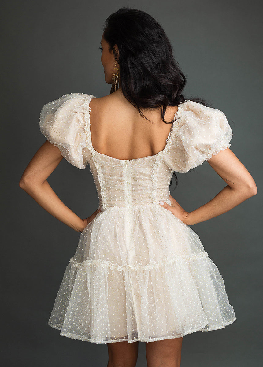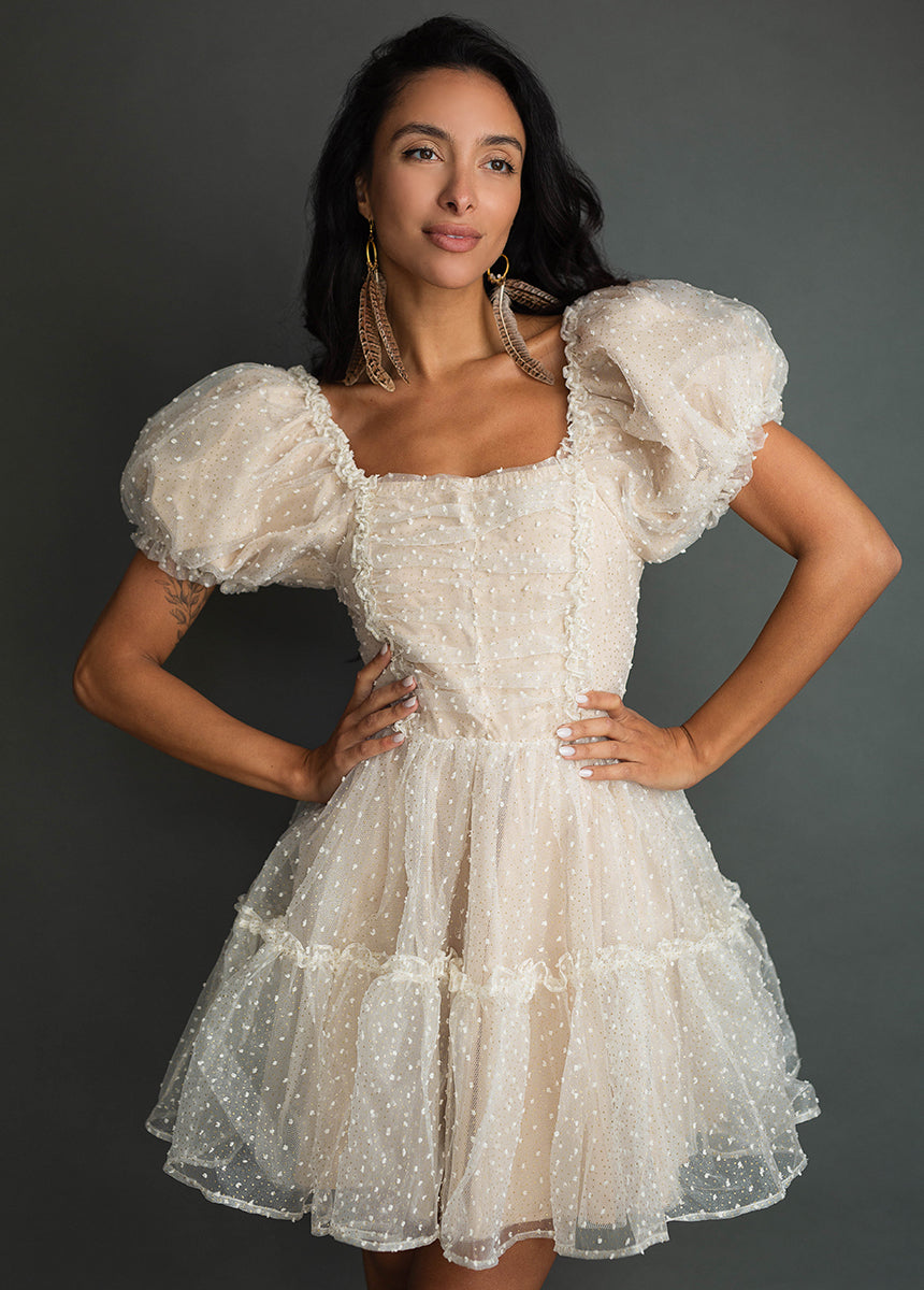 Embrace your playful side with our feminine Perla Dress. This charming short-length dress features a flattering empire waist and a delightful babydoll silhouette that twirls with every step. The puff sleeves add a romantic touch. while the subtle sparkle detail ensures you shine wherever you go. With a lined bodice and skirt for comfort and an invisible zipper at the center back for a seamless finish. this dress is perfect for any occasion. from brunch to evening outings. Capture hearts and turn heads in this enchanting piece!