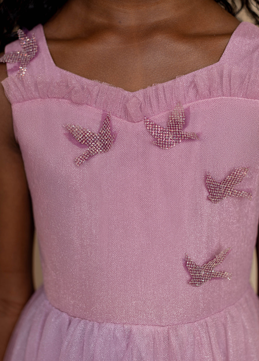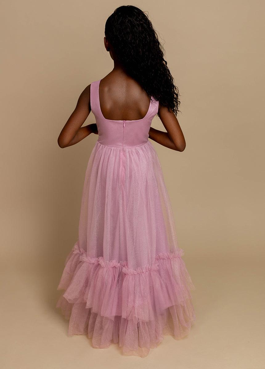 Add a touch of whimsy to her wardrobe with our charming high-low maxi dress. designed for both comfort and style. The delicate sweetheart neckline pairs beautifully with thick straps and a flattering square backline for a timeless look. A playful petticoat skirt with ruffle gives the dress a fun. voluminous silhouette. while the organza sparrow appliques add a unique and feminine detail. The invisible back zipper ensures a seamless fit. and the dress is fully lined for extra comfort and coverage. Perfect for any special occasion. this dress combines elegance and charm in one stunning piece.