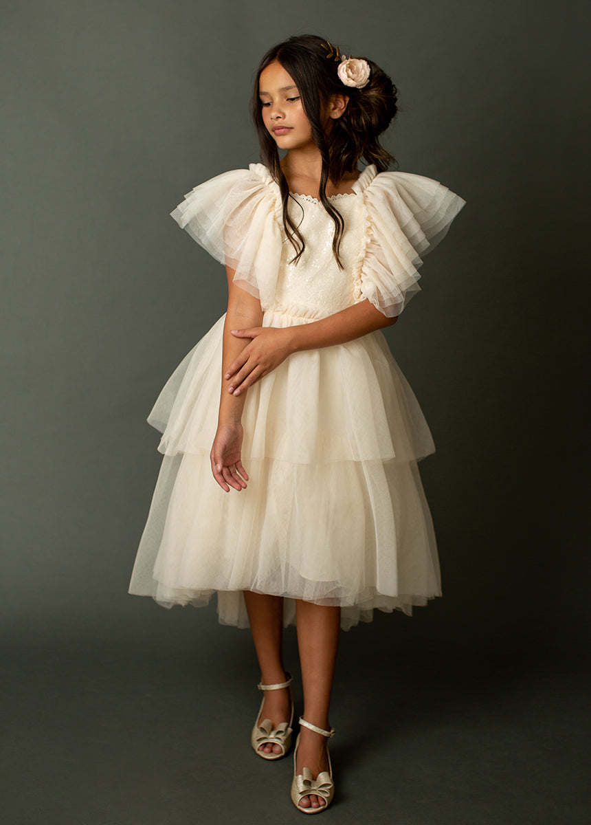 A whimsical metallic kitten heel with a peep toe. ankle strap and bow detail. Pairs wonderfully with the Ayla Dress.